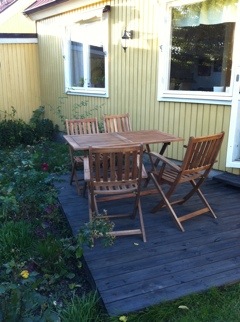 Syrran hade fyndat en liten möbelgrupp som passar till en större balkong eller en mindre uteplats. Den pryder numera vår lilla uteplats på framsidan. Perfekt att ha nu på hösten och fram på våren då det fortfarande är lite kallt att sitta på baksidan.