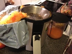Vid senaste leveransen fick vi en extra fruktpåse med 4,5 kg frukt och jag antar att det är ytterligare plåster på såren. Mycket uppskattat men då jag samma dag bunkrat upp med frukt från affären stod vi här med stora mängder frukt. Sicken tur att vi har en råsaftcentrifug och att hela familjen uppskattar ett glas apelsin- och morotsjuice.
