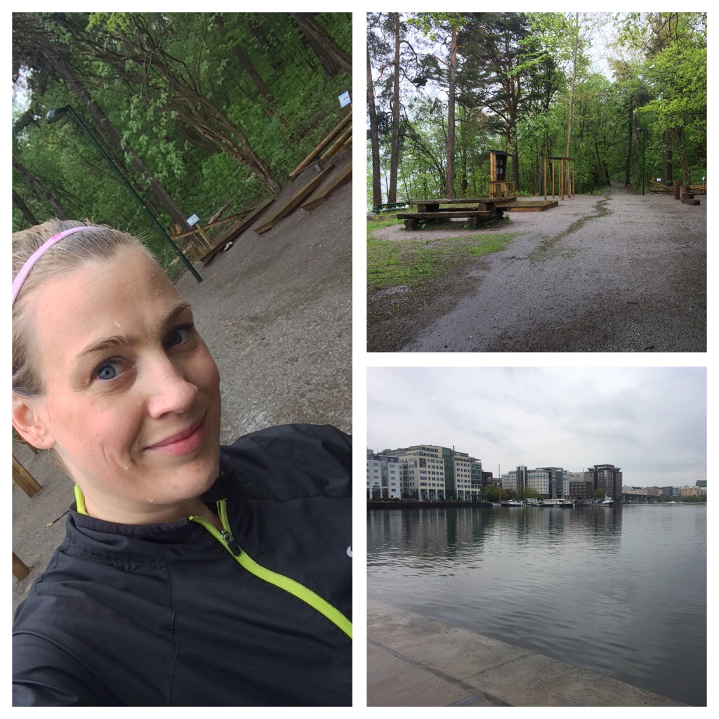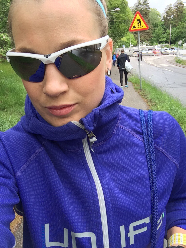 Stack in till Stadion så att jag var där vid kl 11. Starten skulle gå vid kl 12.10. Smörjde in fötter med vaselin och velade lite kring kompressionstrumpor eller vanliga strumpor till mina trekvartstajts. Bestämde mig slutligen för att köra kompression för att hjälpa mina vader och benhinnor. Fortsatte smörja in med vaselin på alla potentiellt skavbenägna områden (insida överarm, lår, knäveck, under sport-bh-kanten, kring midjan). Knatade iväg till startfållan och när det började regna bannade mig själv att jag hade glömt regnskydd aka sopsäck eller poncho.
