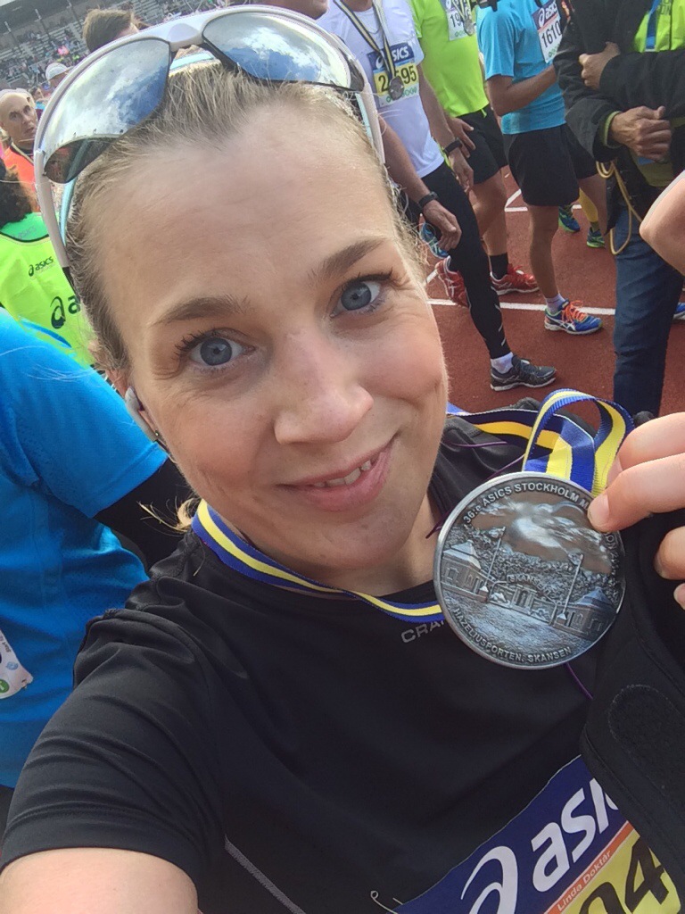 Efter Västerbron kom bästa Sara farandes och hejade och sprang med mig en bit. Så oändligt skönt att se ett välkänt ansikte. Tog mig därefter bort till Martin som stod strax innan Stadshuset. Han frågade om jag ville bryta men när det nu bara var 7 km kvar så var målgången, medaljen och tishan så nära så nära. Jag tänkte att knappt 7 km är jättekort och att det är något jag nästan kan springa i sömnen. Martin sprang med mig i en kilometer lite drygt och med 5 km kvar så tänkte jag att det här fixar jag. Jag går, springer och tar mig fram. Jag kommer att gå i mål, kanske långsammare än förra året, men jag kommer att göra det. Tänkte på Stadion och målgången. Önskade att jag hade orkat springa från Odenplan till mål men var tvungen att gå vid ett par tillfällen. Strax innan 41 km-skylten så började jag öka. Jag sprang förbi många trötta löpare på Sturegatan. När jag såg Martin och Stadion så körde jag på ännu mer. Nu var det bara in i mål som gällde. Här kan vi snacka lättnad, stolthet och glädje. Jag hade persat trots att kroppen inte var med mig och trots att loppet var långt ifrån det lyckoruslopp som jag hade förra året. Jag hade en mage som skötte sig exemplariskt och benhinnan var inte ledsen en enda gång. Jag lyckades även återigen visa prov på den envishet jag bär på.