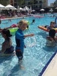 Vi har badat i poolen och åkt vattenrutschkana. Lowa har övat på att simma och att dyka efter ringar medan Wilja övervunnit sin rädsla för att flyta med puffar. Vi har badat i havet och det var underbart. Dessvärre var Lowa svårare att övertyga så det blev bara ett strandbesök.